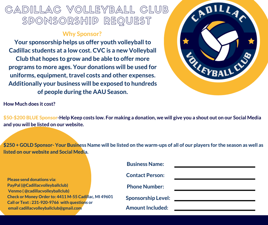 We are asking for business sponsorships to help our new club and to keep the cost of play affordable. Business sponsors will be recognized on our website and through our Facebook page and on warm up shirts if we get at least two sponsorships per team. We are now a 501(c)3! Please send your donation of $250 or more to Cadillac Volleyball Club - 4411 M-55- Cadillac, MI 49601. Thanks so much for your support of the program and of our girls! CLICK HERE to see our 2025 sponsor list!